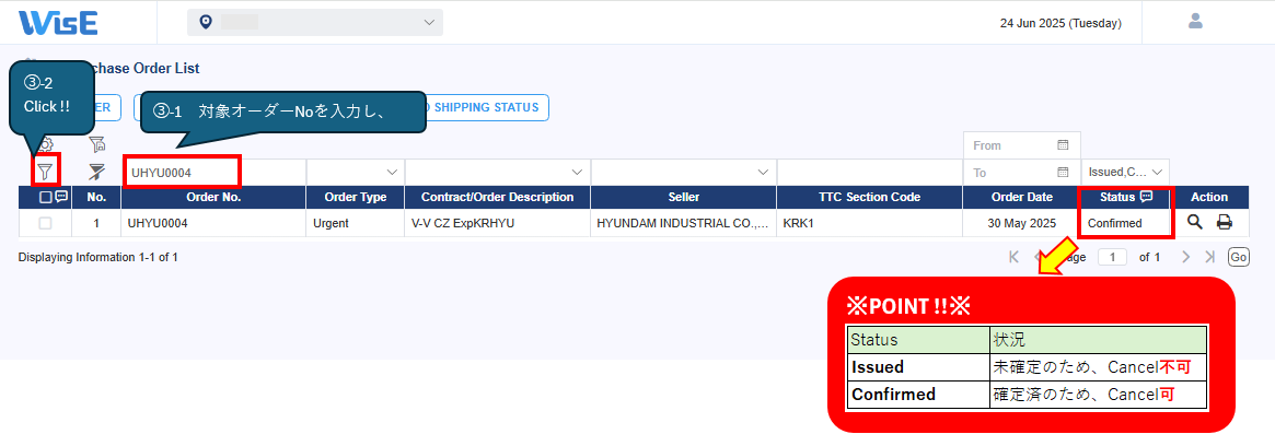 該当オーダーが「受注確定」されていない場合、キャンセル処理は出来ません。