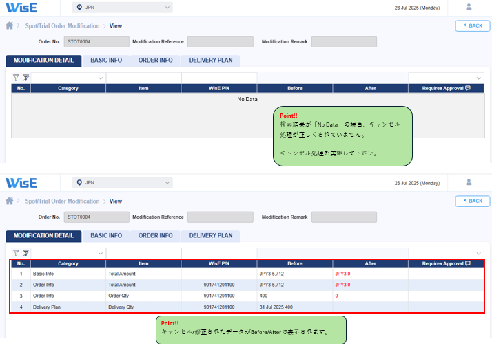 ※キャンセルが正しく処理されている場合、上記の通りAfterの発注数量がゼロで表示されます。