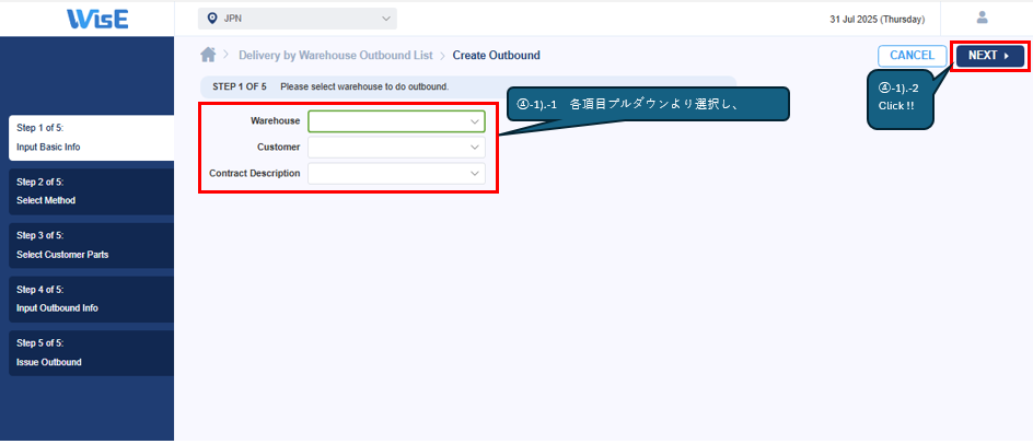 ④-1).Delivery by Warehouse Outbound List > Create Outbound