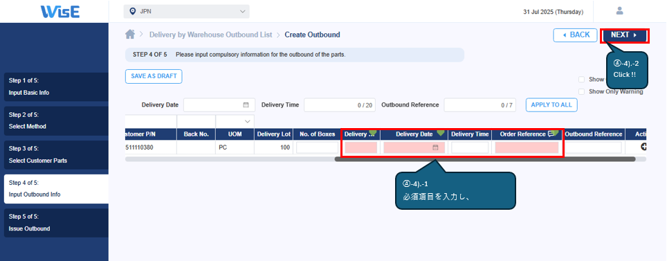 ④-4).Delivery by Warehouse Outbound List > Create Outbound