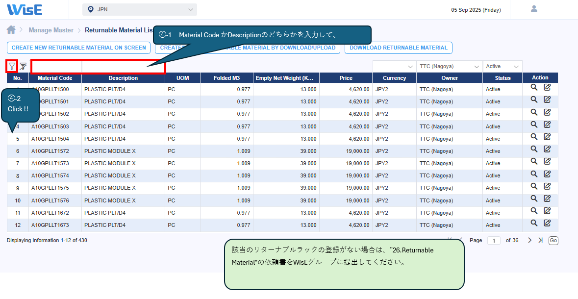 新規の梱包材が再利用梱包材の場合、TLS/KUCから必要情報を入手し、WisEグループへ”26.Returnable Material”の依頼書を提出してください。