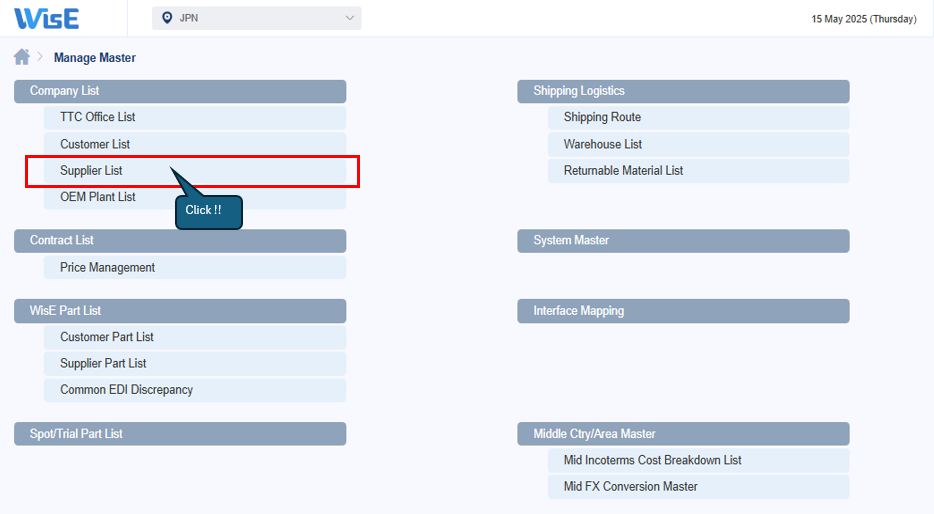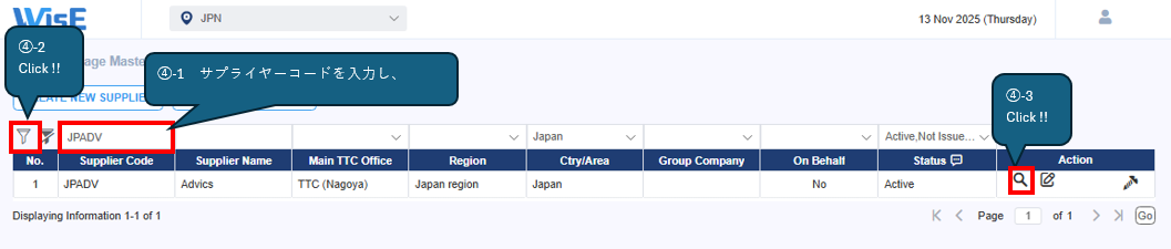 WisEの「Manage Master」画面で「Supplier List」を開き、対象の仕入先名で検索してください。