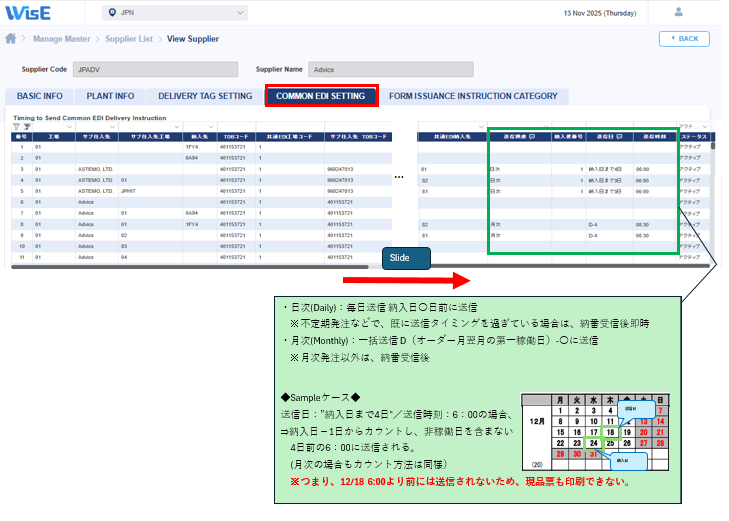 納入指示の送信タイミングは、Supplier ListのCommon EDI Settingより確認できます。