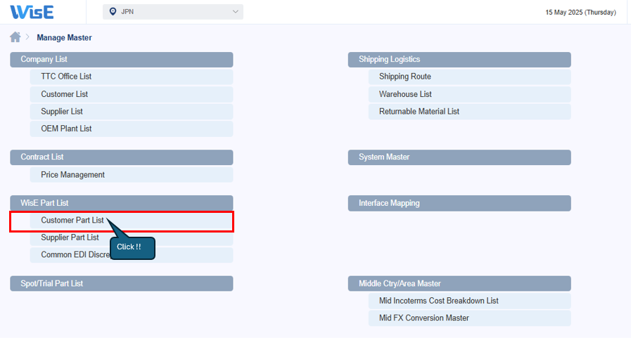 ③WisE Part List > Customer Part List