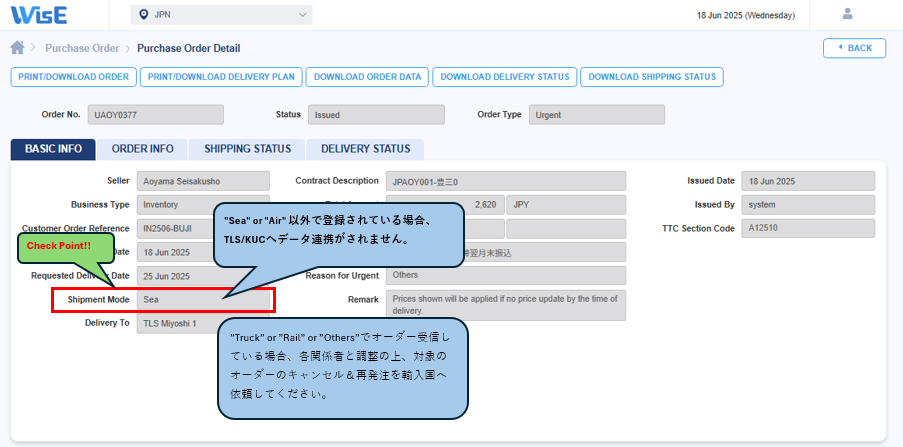 「Shipment mode」が “Sea” “Air”以外の場合、TLS/KUCにはデータ連携されません。