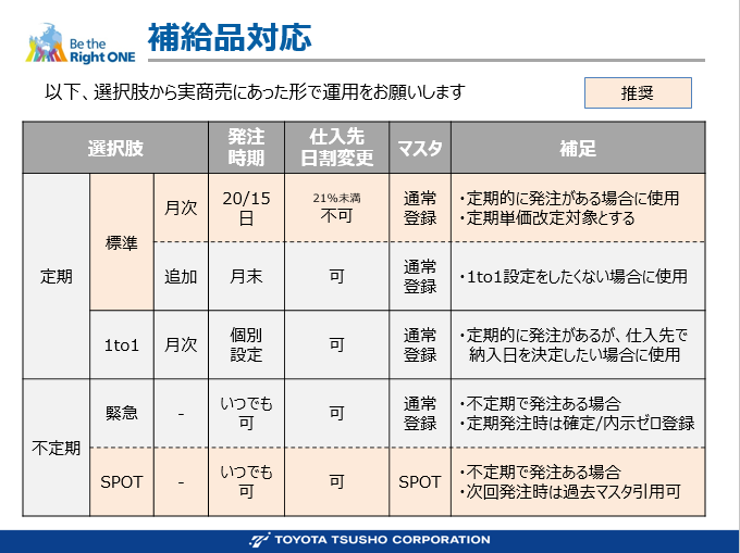 また補給品を1 to 1にするのかどうかは、下記の資料「補給品対応」をご参照頂き、各商売にあった運用設定をお願い致します。